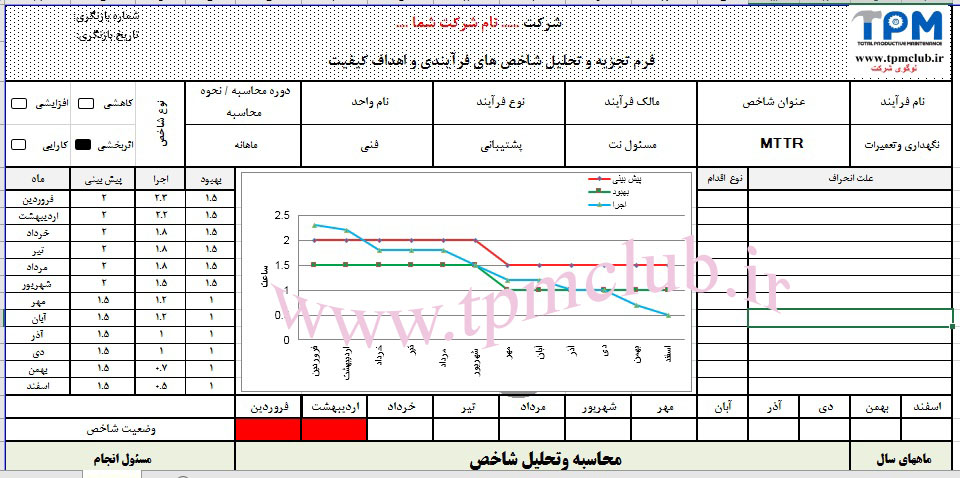 رای اون دسته از عزیزانی که به دنبال فرم اکسل محاسبه و تحلیل شاخص MTTR بودن، پیشنهاد میکنیم که از فرم زیر استفاده کنن. این فرم فرمول نویسی شده و کاملا آماده جهت استفاده هست و فقط کافیه اعداد رو داخل جدول داده شده وارد کنین تا گراف های لازم رو براتون رسم کنه ؛پکیج زیر شامل سه نمونه فایل اکسل محاسبه شاخص MTTR می باشد که می توانید بنابه نیاز سازمان خود از هر یک از آنها استفاده نمایید.